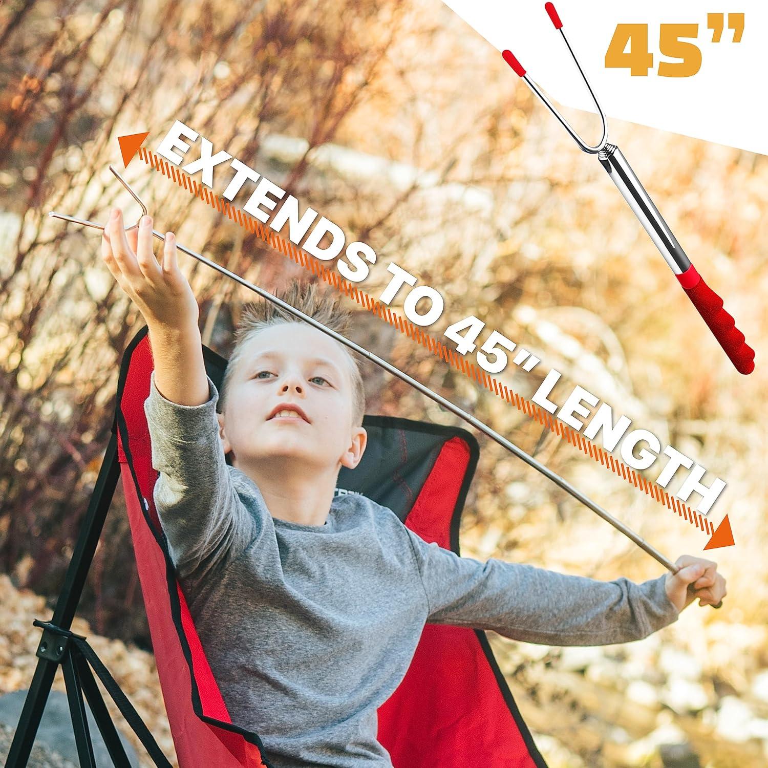 THE SAFER, STRONGER ROASTING FORK: Get ready to enjoy the best balance of easy roasting and superior safety. These 45 inch telescopic smores sticks are longer and stronger, helping kids to roast smores by fire pits at the safest distance possible.